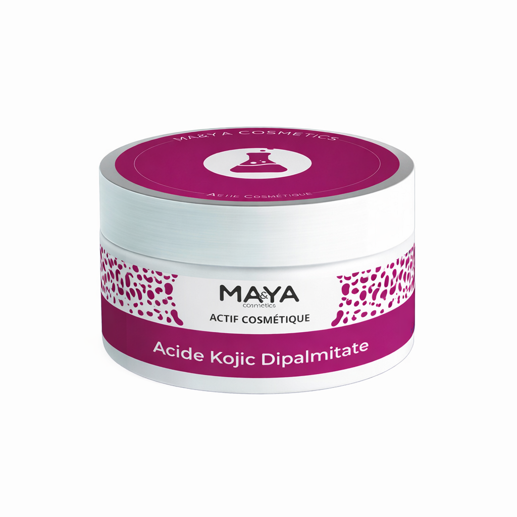 L’acide kojic dipalmitate est une forme stabilisée et liposoluble de l’acide kojic, largement utilisée en cosmétique pour ses propriétés éclaircissantes et uniformisantes du teint. Il est particulièrement prisé pour les soins des peaux sujettes aux taches pigmentaires.